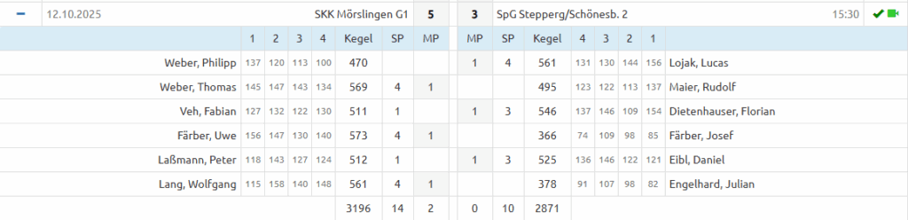 Am Ende stand es nach den sechs direkten Duellen 3:3. Da Mörslingen jedoch das Gesamtholz deutlich gewann, gingen die beiden Zusatzpunkte an die Gastgeber. Damit lautete der offizielle Endstand 5:3 für SKK Mörslingen. Für Stepperg/Schönesberg 2 war es die vierte Niederlage im vierten Spiel. Mit 0:8 Punkten und nur zehn erspielten Mannschaftspunkten bleibt das Team Tabellenletzter und steht bereits unter Zugzwang.